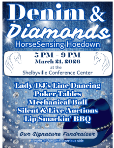 Saddle up! You’re invited to HorseSensing Hoedown- Denim and Diamonds! Our annual fundraising dinner at the Shelbyville Conference and Welcome Center on March 21, 2026 This will be a boot-scooting great time! Come and enjoy great BBQ, signature cocktails, a country music DJ and dancing. This year we have more poker tables! Of course we will also have a silent and live auction! Great opportunity for a date night! This event promises to be nothing short of lots of fun! An event filled with your favorite country music and line dancing! There is bull riding and contests for the longest rider-both gals and guys! So dust off your cowboy hat and shine your boots, because this is a Country themed event. Cowboys and cowgirls welcomed!
